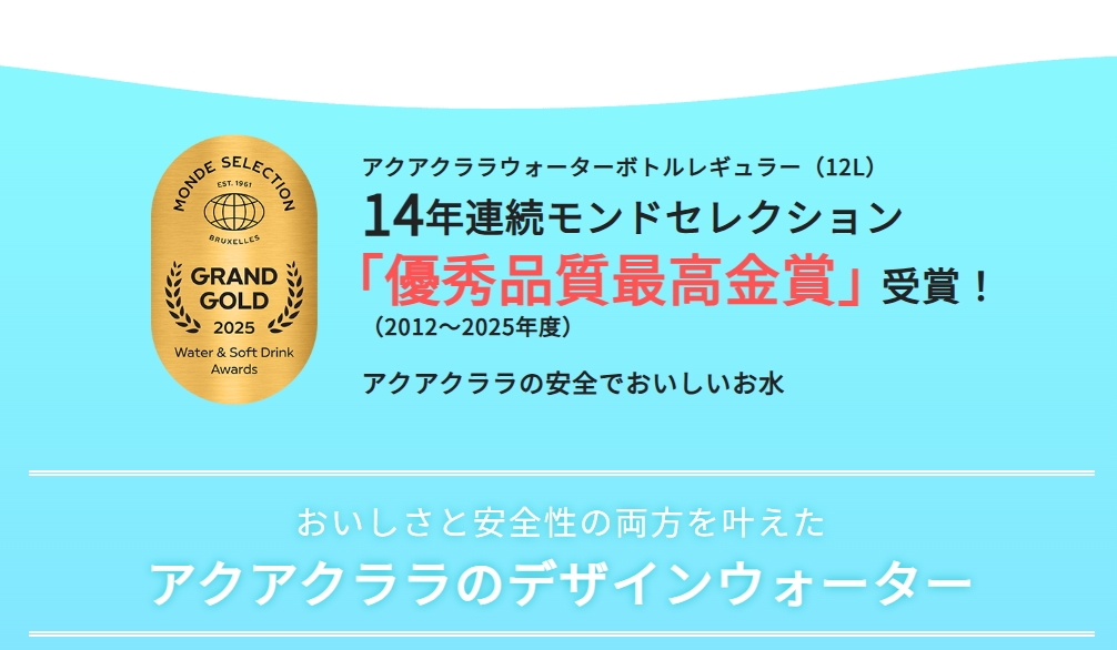 アクアクララは全国に展開する大手ウォーターサーバーブランドで、長年モンドセレクションを受賞している高品質な「デザインウォーター」を提供しています。